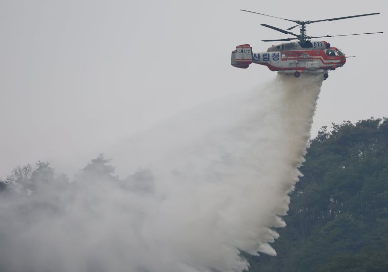 28일 오전 경북 영양군 석보면 일대에서 산림청 헬기가 방수 작업을 벌이고 있다. /연합뉴스 |