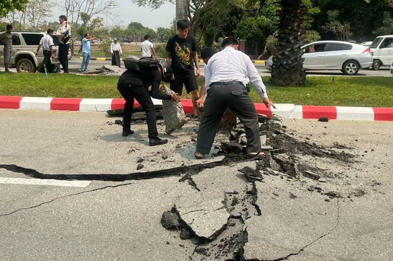28일 미얀마 수도 네피도에서 사람들이 강진으로 갈라진 도로에 모여 있다. AFP 연합뉴스 |