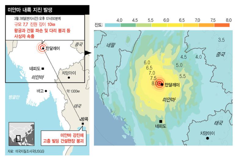 28일 미얀마에서 발생한 규모 7.7과 6.4의 연이은 지진은 중국과 라오스에서도 느낄 만큼 강력했다.