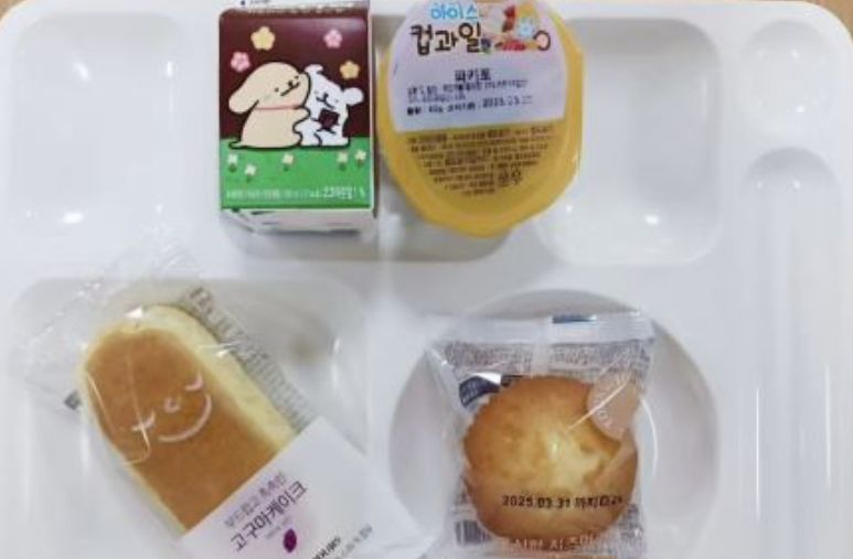 28일 김경화는 개인 채널에 "저희 둘째가 학교에서 먹은 급식입니다. 간식도 아니고. 점심 시간에 나온 급식입니다"라며 고구마케이크, 치즈머핀과 컵과일, 초코우유가 담긴 식판 사진을 게시했다.