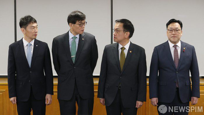 [서울=뉴스핌] 정일구 기자 = 이복현 금융감독원장(왼쪽부터), 이창용 한국은행 총재, 최상목 부총리 겸 기획재정부 장관, 김병환 금융위원장이 19일 오전 서울 중구 은행회관에서 열린 거시경제금융회의에 참석해 대화하고 있다. 2024.12.19 mironj19@newspim.com