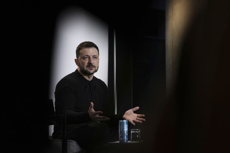 볼로디미르 젤렌스키 우크라이나 대통령이 27일(현지시간) 프랑스 파리에서 열린 ‘의지의 연합’ 참여국 정상 회의에 참여한 뒤 취재진과 이야기하고 있다. [AP] |