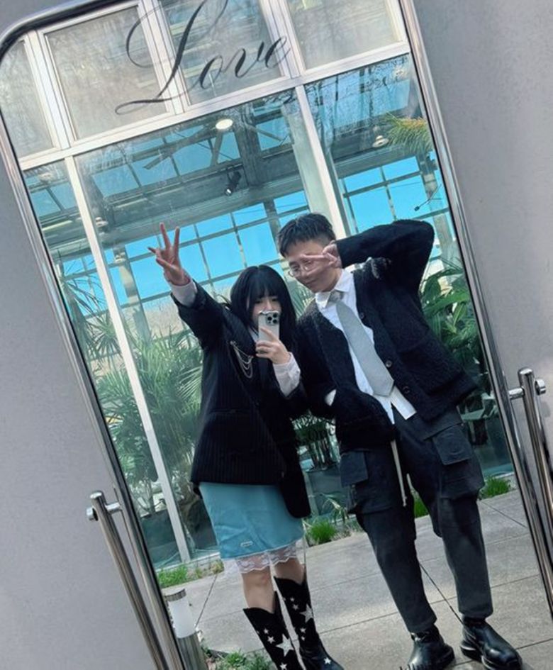용준형 또한 검정 재킷과 넥타이로 현아와 커플룩을 완성했다. 두 사람은 거울 앞에서 포즈를 취하며 행복한 한 떄를 만끽하는 듯한 모습이다.