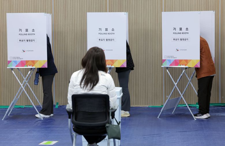 29일 서울 구로구 개봉2동 주민센터에 마련된 4·2 재보궐선거 사전투표소에서 유권자들이 투표에 참여하고 있다./뉴스1 |