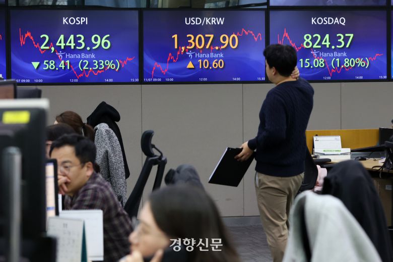 공매도 금지 조치에 전날 폭등했던 국내 증시가 하락세로 돌아선 2023년 11월 7일 서울 중구 하나은행 딜링룸 전광판에 지수가 표시돼 있다. 조태형 기자 |