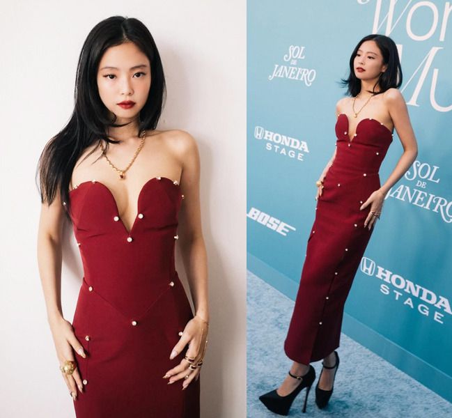 사진 속 제니는 와인빛 튜브톱 드레스를 입고 고혹적인 아우라를 뽐냈다. 과감한 하트 컷 아웃 디테일이 돋보이는 드레스는 상반신을 감싸는 곡선 바스트 쉐입과 슬림하게 떨어지는 허리 라인으로 시선을 사로잡았다. 곳곳에 배치된 진주 버튼은 고급스러움을 더했고, 제니 특유의 시크한 매력이 더해져 분위기를 압도했다.