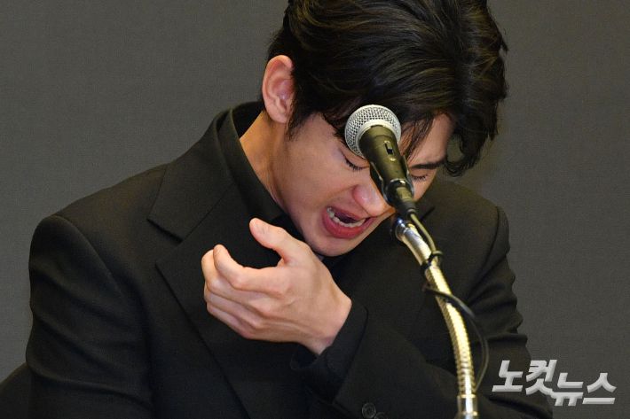 배우 김수현이 31일 오후 서울 마포구 스탠포드 호텔에서 기자회견을 열고 미성년자였던 고 김새론과 교제했다는 의혹 등에 대해 입장을 밝히고 있다. 류영주 기자