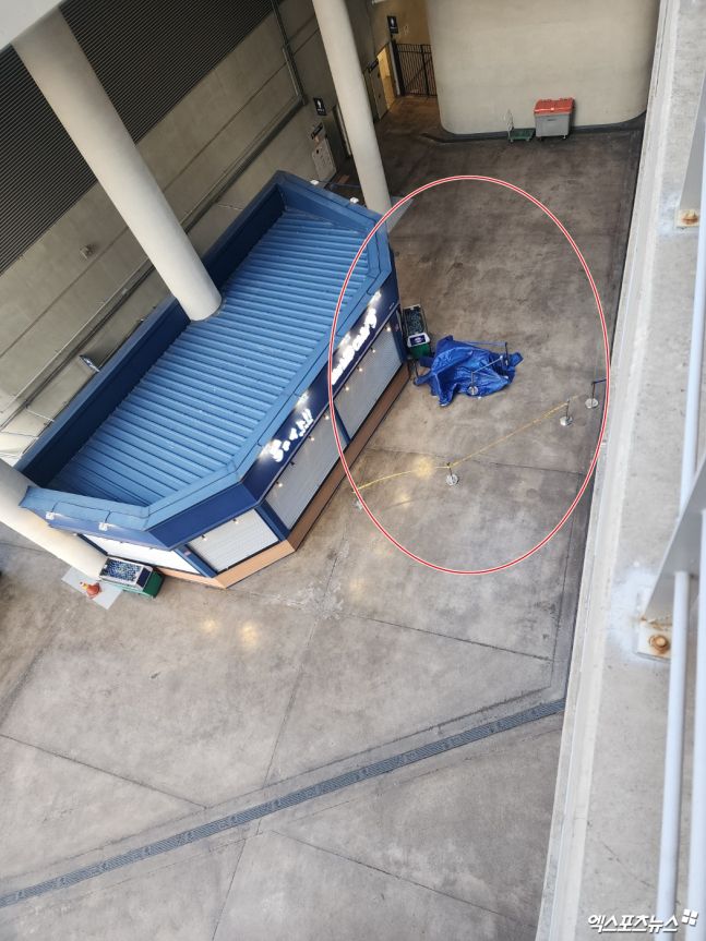 이번 사고는 3루쪽 매점벽에 설치되어 있던 알루미늄으로 된 길이 2.6m, 폭 40cm, 무게 60kg짜리 외장 마감 자재 '루버'가 떨어진 게 문제였다.