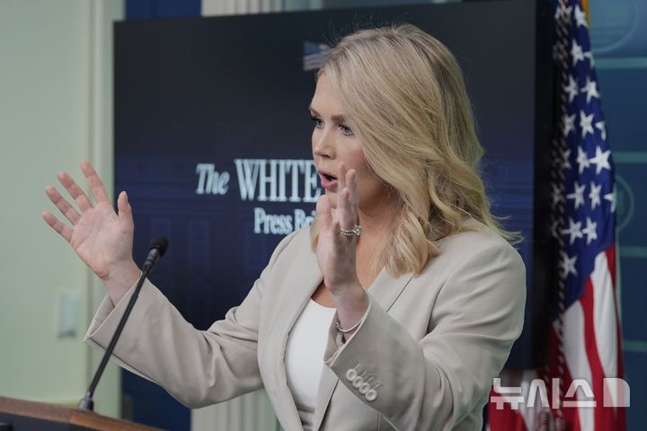 [워싱턴=AP/뉴시스]캐롤라인 레빗 미국 백악관 대변인이 1일(현지 시간) 정례브리핑에서 취재진 질문에 답하고 있다. 2025.04.02. |