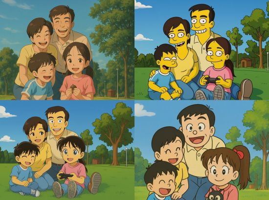 챗GPT에 올린 가족사진을 변환한 애니메이션 화풍별 그림. 왼쪽 위부터 시계방향으로 지브리, 심슨, 코난, 도라에몽 스타일이다.(그림=챗GPT)