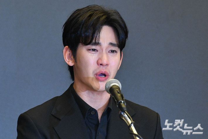 배우 김수현이 31일 오후 서울 마포구 한 호텔에서 기자회견을 열고 미성년자였던 고 김새론과 교제했다는 의혹 등에 대해 입장을 밝히고 있다. 류영주 기자 |