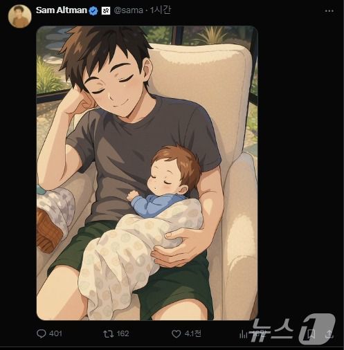 샘 올트먼 오픈AI CEO는 1일(현지시간) 아기를 안고 있는 본인 사진의 지브리 스타일 변환 이미지를 X에 게재했다. (X 갈무리) |