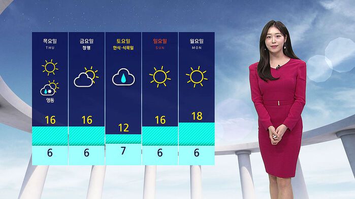 서울의 낮 최고 기온 15도, 대구는 18도 예상됩니다.