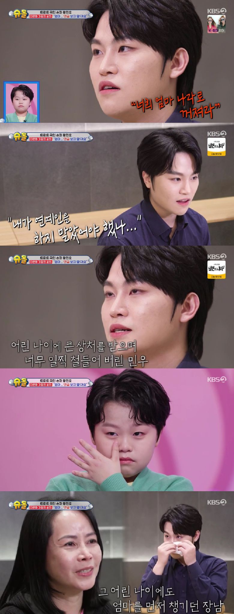 황민우의 어머니는 "한국 엄마들은 아이들 자기 전에 같이 이야기도 많이 하고 자는데 전 그런 적이 별로 없었다"며 미안한 마음에 울컥했고, VCR을 보던 황민호와 황민우 역시 눈물을 보여 안타까움을 자아냈다.