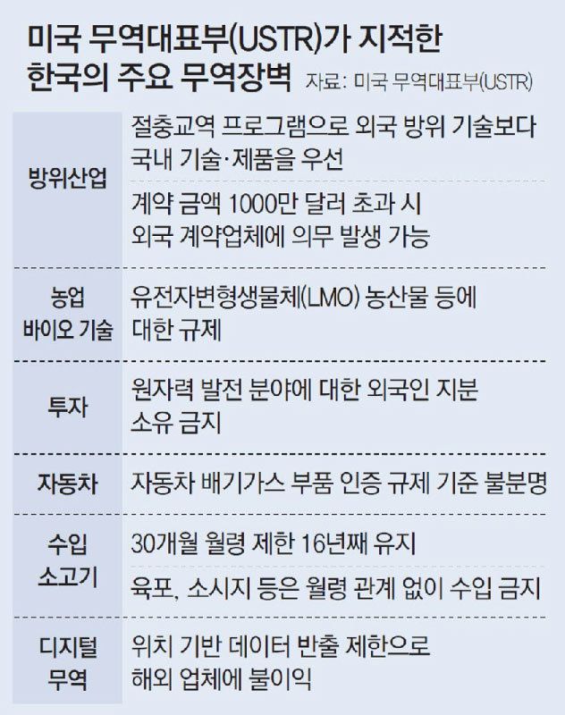 문제는 미국 기업들의 민원에 불과한 억지 요구들을 빌미로 한국에 높은 상호관세를 물릴 가능성이 있다는 점이다. 이르면 오늘 중 이런 비관세 장벽들을 반영해 결정한 상호관세율을 한국에 통보하고, 이를 지렛대 삼아 많은 양보를 얻어내려 할 것이다. 정부는 글로벌 스탠더드에 맞지 않는 국내 규제를 선별적으로 풀더라도, 핵심 국익을 침해하는 부당한 요구에는 단호하게 대응해야 한다.
