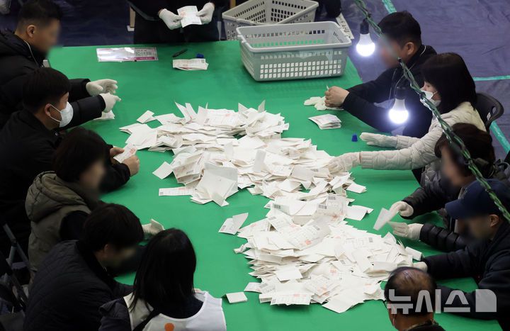 [부산=뉴시스] 하경민 기자 = 부산교육감 재선거 투표일인 2일 부산 남구 국립부경대학교 체육관에서 관계자들이 개표작업을 하고 있다. 이번 선거 최종 투표율(잠정)은 22.8%로 집계됐다. 2025.04.02. yulnetphoto@newsis.com |