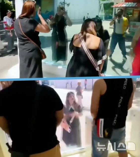 영상을 보면, 처음에는 놀이공원 여성 관광객들이 대형 거울 앞에서 머리를 정리하거나 화장을 고치고 있다. 여기까지는 평범한 광경이지만, 이어지는 장면이 충격적이다.