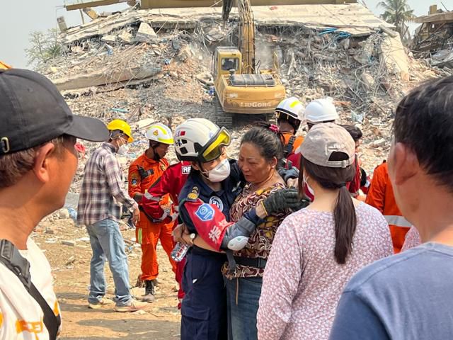 다른 중국 구조대원들과 미얀마인 자원봉사자들이 곧바로 잔해 사이를 확인할 내시경 카메라와 철근을 자를 화염방사기, 소독제 등을 짊어지고 잔해 위로 뛰어올라갔다.
