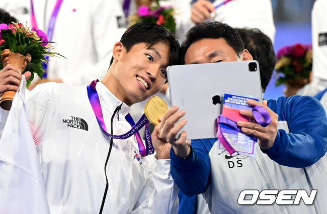 [OSEN=항저우(중국), 최규한 기자] 모든 역경을 뚫어내고 황선홍호가 금메달을 거머쥐었다.황선홍(55) 감독이 이끄는 대한민국 아시안게임 축구 국가대표팀은 7일 오후 9시(이하 한국시간)부터 중국 항저우의황룽 스포츠센터 스타디움에서일본과 2022 항저우 아시안게임 결승전을 치러 2-1로 승리했다.금메달을 거머쥔 한국 정우영이 스태프와 함께 기념촬영을 하고 있다. 2023.10.01 / dreamer@osen.co.kr |