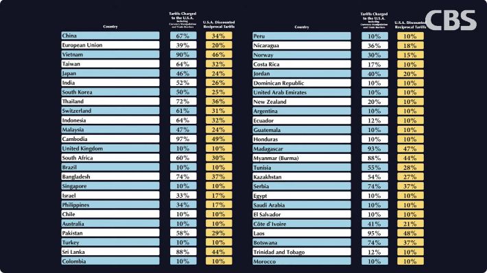 ◇ 김현정> 여러분, 보시기에 왼쪽에 있는 수치가 원래는 이 정도 매겨야 상호 관세인데 우리가 이만큼 깎아줬어요. 오른쪽 노란 색깔이 실제로 매긴 거라는 거예요. 우리나라만 한번 따로 떼서 보면 사우스 코리아 원래는 50% 관세 매겨야 되는데, 즉 1,000원짜리 볼펜 미국한테 수출하면 여기에 50%는 세금으로 물어야 되는데 25%를 깎아준다. 이거예요. 그리고 다른 나라 한번 볼게요. 중국 34, EU 20, 베트남 46, 타이완 32, 일본 24, 인도 26, 태국 36, 스위스 31, 인도네시아 32 이런 식으로 쭉 발표를 했는데 칠레, 호주 이런 곳은 10%네요. 저기 모로코도 보니까 10%고.