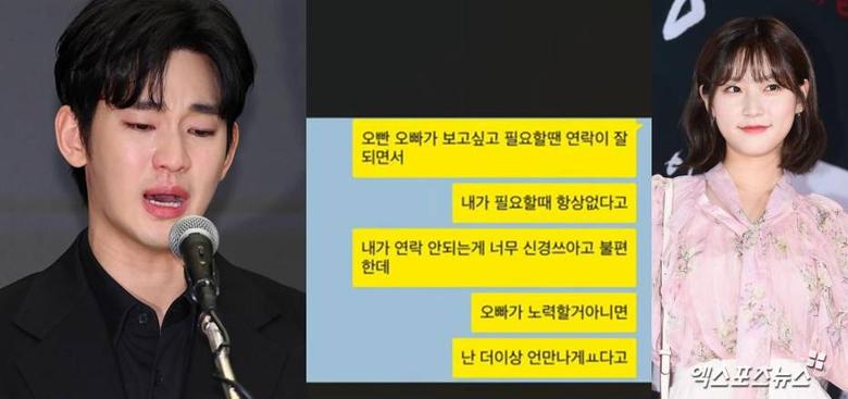 2018년 김새론이 김수현에게 보낸 카톡 캡쳐본이라며 "오빤 오빠가 보고 싶고 필요할 땐 연락이 잘 되면서 내가 필요할 때 항상 없다고 내가 연락 안 되는 게 너무 신경 쓰이고 불편한데 오빠가 노력할 거 아니면 난 더 이상 언만나게ㅛ다고(안만나겠다고)"라는 문구가 담긴 사진을 공개했다.