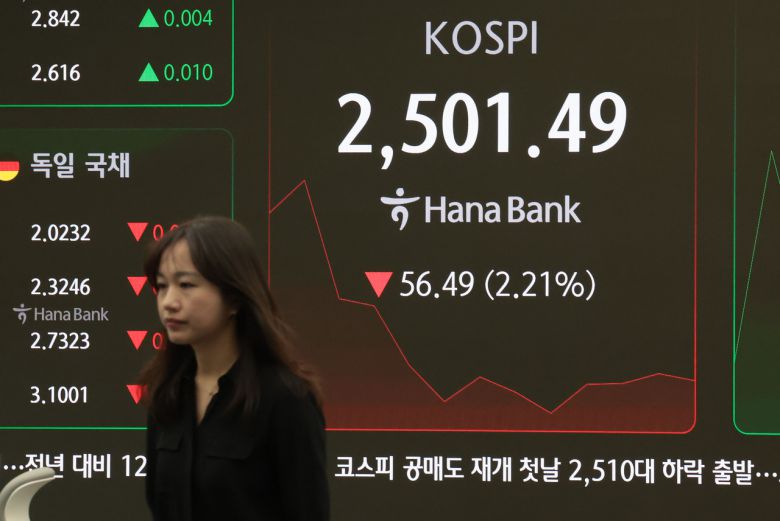 지난 1년 5개월간 금지됐던 공매도가 전면 재개된 31일 서울 중구 하나은행 본점 딜링룸 현황판에 코스피 지수 등이 표시되고 있다. [연합]