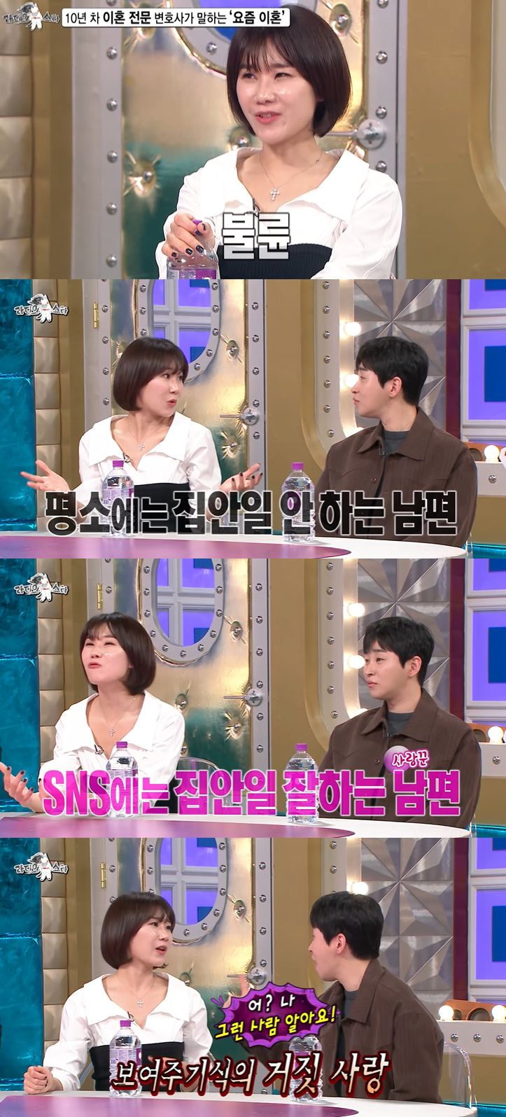 이어 그는 "평소에 집에서 남편이 아무것도 안 도와줘 놓고, SNS에는 사랑꾼인 것처럼 '우리 아내를 위한 밥상' (이라고 올린다)"라며 '보여주기식의 거짓 사랑'이 문제가 된다고 설명했다.