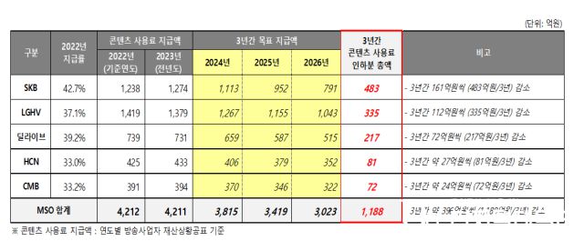 감액 규모는 ‘n+2년 목표 지급액’과 ‘전년도(n-1년) 실제 지급액’ 간 차액을 삼등분한 금액으로, 향후 3년 간(2024년~2026년) 감액분은 ▲LG헬로비전 483억원 ▲SK브로드밴드(SO) 335억원 ▲딜라이브 217억원 ▲HCN 81억원 ▲CMB 72억원 등 총 1188억원으로 추정됐다.