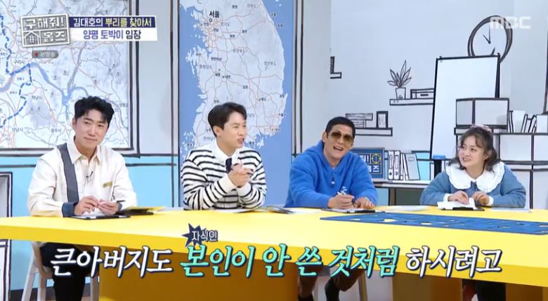 이를 들은 양세형과 박나래는 "자식이 쓴 거 아닌 거서럼 하려고 '김승선 씨'라고 적었다. 스스로 세운 비석은 불법 아니냐", "저거 비석을 막 세워도 되냐"고 궁금해 했다. 그러자 김대호는 "큰아버지 땅"이라고 해명했다.
