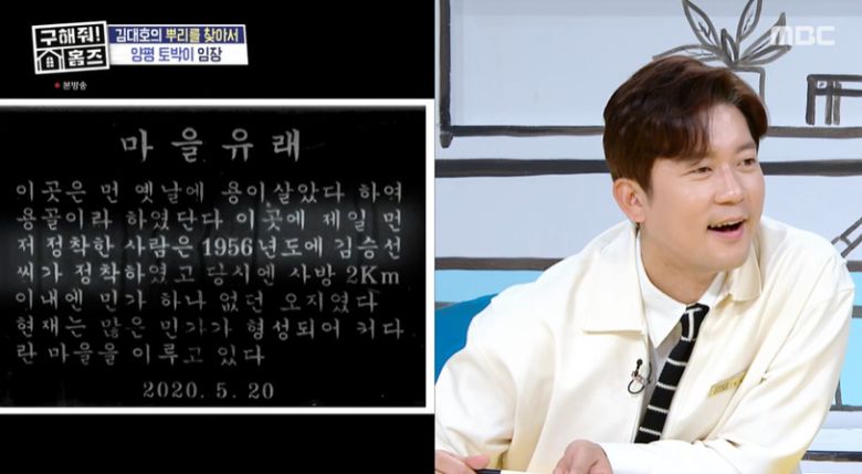 실제로 마을에 세워진 비석에는 '마을 유래. 이곳은 먼 옛날에 용이 살았다 하여 용골이라 하였단다. 이곳에 제일 먼저 정착한 사람은 1956년도에 김승선 씨가 정착하였고 당시엔 사방 2km 이내엔 민가 하나 없던 오지였다. 현재는 많은 민가가 형성되어 커다란 마을을 이루고 있다'고 적혀 있었다. '김승선'이 김대호의 할아버지라고.