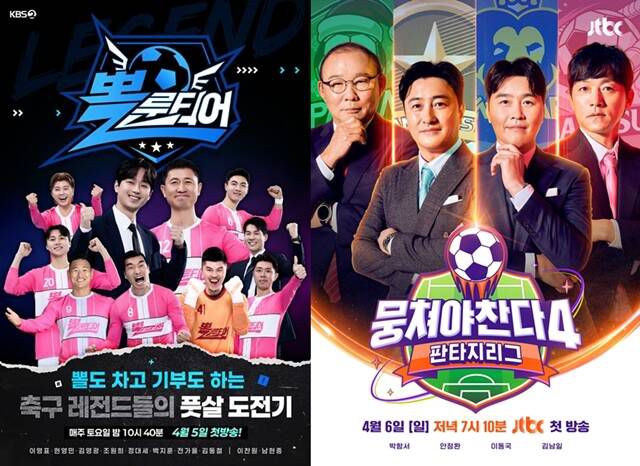 KBS2 예능프로그램 '뽈룬티어'(왼쪽), JTBC 예능프로그램 '뭉쳐야 찬다4', MBN 예능프로그램 '뛰어야 산다'가 4월 시청자들과 만난다. /KBS2, JTBC