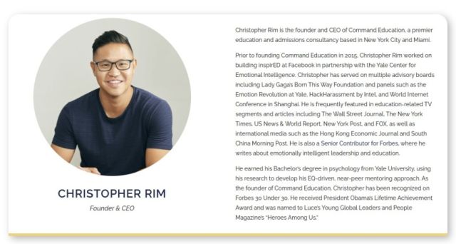 커맨드 에듀케이션은 학생들의 시험 준비, 봉사활동 등 입시와 관련된 모든 과정을 관리한다. 연간 비용은 12만 달러(약 1억7600만 원)로 중학교부터 대학에 입학할 때 까지 모든 과정을 포함한 패키지는 무려 75만 달러(약 11억 원)에 달한다.