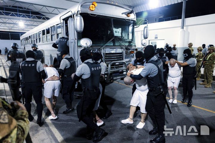 [테콜루카=AP/뉴시스] 지난달 31일(현지 시간) 엘살바도르 테콜루카 '테러범 수용소'(CECOT·세코트)에서 교도관들이 미국으로부터 추방된 이주자들을 압송하고 있다. '세코트'는 세계에서 보안 등급이 가장 높은 교도소로 알려져 있다. 미 연방법원이 4일 미국이 엘살바도르로 보낸 이민자1명을 다시 데려오도록 명 령했다. 2025.04.05. |