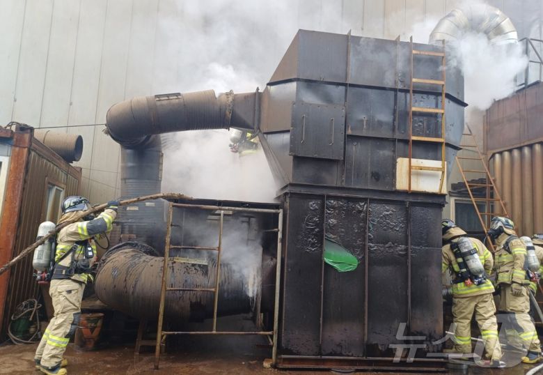 5일 오전 8시 14분께 충남 아산시 배방읍 세출리의 플라스틱 용기 제조공장에서 화재가 발생해 외부 집진설비 등을 태운 뒤 26분만에 진화됐다.(아산소방서 제공. 재판매 및 DB금지)/ 뉴스1