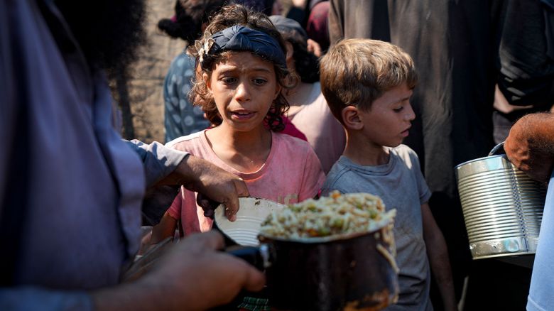 ▲ 가자지구 중부 데이르 알발라에서 음식을 나눠받고 있는 팔레스타인 어린이들
