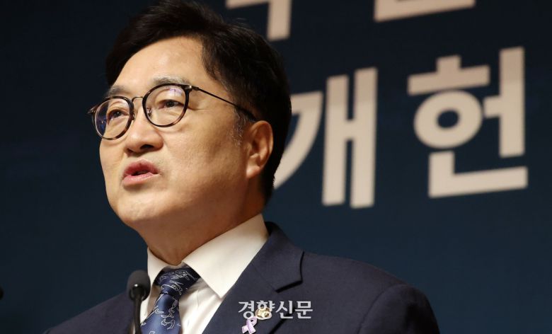 우원식 국회의장이 6일 국회 사랑재에서 개헌관련 특별담화를 하고 있다. 박민규 선임기자