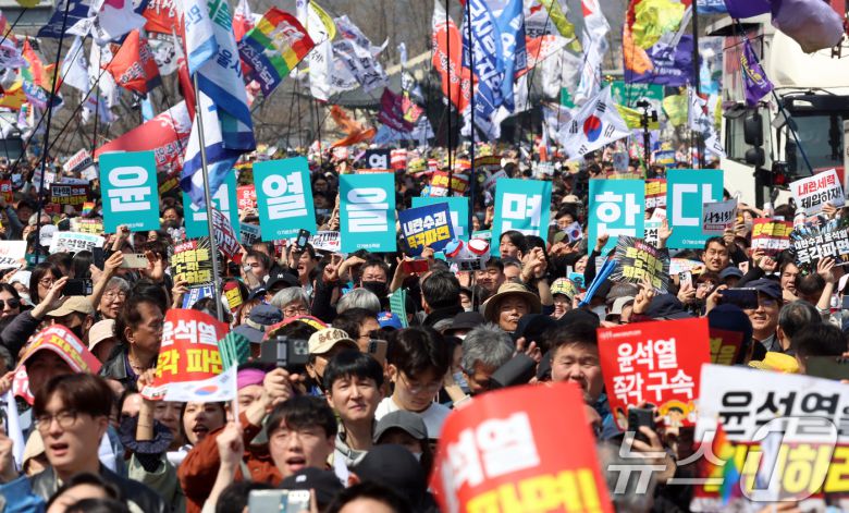 윤석열 대통령 탄핵심판 선고일인 4일 오전 서울 종로구 안국역 인근에서 열린 탄핵 촉구 집회 참가자들이 탄핵이 인용되자 기뻐하고 있다. 2025.4.4/뉴스1 ⓒ News1 김명섭 기자