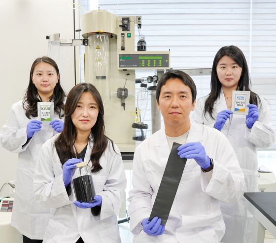 (앞줄 왼쪽)KIMS 윤지희 선임연구원과 KERI 황인성 선임연구원이 분무 건조 기법을 활용해 고용량 이차전지 건식전극을 제조하는 데 성공했다/사진=전기연