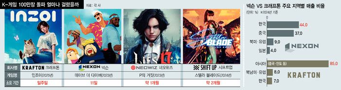국내 게임업계 ‘투톱’인 넥슨과 크래프톤이 최근 출시한 신작 게임이 게임 이용자(게이머)들의 호평을 받으며 흥행 청신호를 켰다. 그동안 ‘케이(K)-게임’의 한계로 지적됐던 확률형 아이템 등에 기반한 과금 수익 구조를 벗어나, 작품성을 내세운 신작이 게이머들에게 통했다는 평가가 나온다.