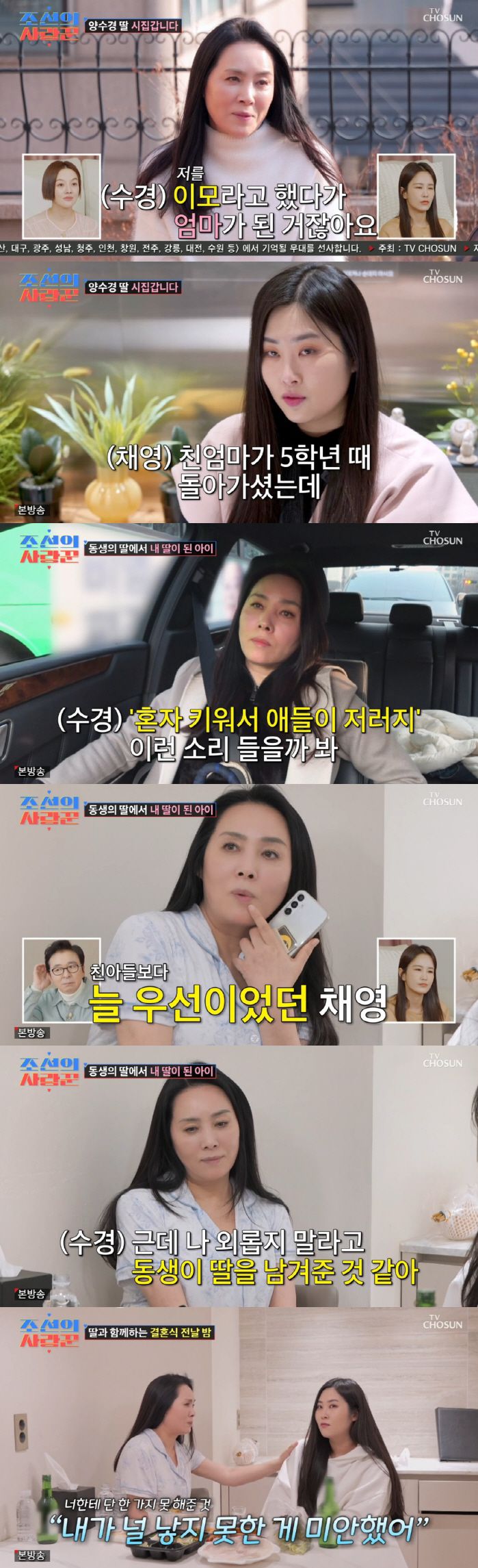 2009년 먼저 세상을 떠난 여동생의 두 아이를 입양한 후 자신이 낳은 아들까지 총 세 명의 자녀를 혼자 양육했다는 양수경. 조카이자 딸인 윤채영은 "엄마가 5학년 때 돌아가셨는데 이모가 우리를 입양해 주셨다"고 말했다.