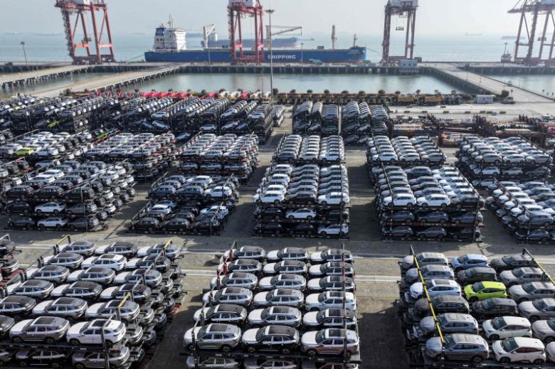지난 7일 중국 장쑤성 쑤저우의 타이창 항구에 중국 전기차 브랜드 BYD의 수출용 차량들이 쌓여 있다.AFP연합뉴스