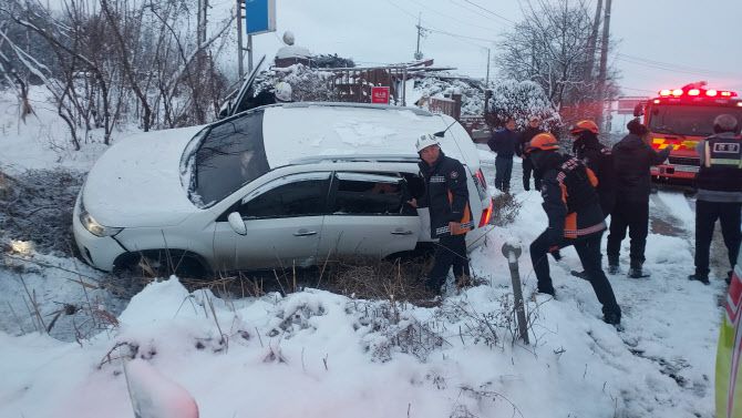 지난 2월 4일 전북 정읍시 소성면의 한 도로에서 차량이 눈길에 미끄러져있다. (사진=전북자치도소방본부 제공) |