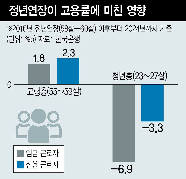 일률적인 정년연장은 고령층 고용을 늘리지만 청년 노동자 채용을 감소시킨다는 분석을 한국은행이 내놨다. 한은은 고령층의 계속근로를 확대하려면 일본처럼 임금조정을 동반한 ‘퇴직후 재고용’ 방식이 적절하다고 제안했다. 노동계와 정치권을 중심으로 진행되는 정년연장 논의에 사실상 반대하는 주장이어서 논란이 예상된다.