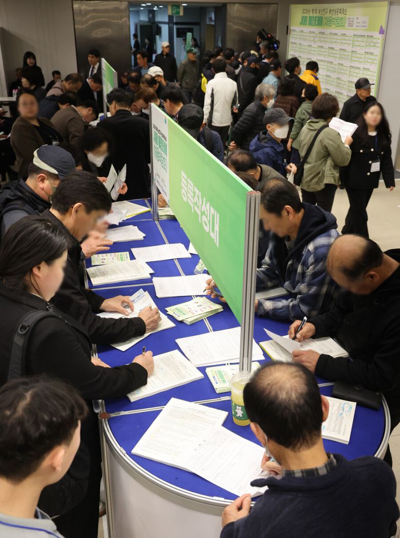지난 3월27일 상공회의소 2층 행사장에서 열린 ‘2025년 제1회 부산진구·부산상공회의소 JOB 매칭데이’ 채용박람회에서 구직자들이 구직신청서와 이력서를 작성하고 있다. 연합뉴스 |