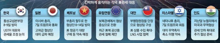 세계 각국은 트럼프 행정부와 협상을 진행하기 위해 분주한 움직임을 보이고 있다. 스콧 베선트 미국 재무장관도 폭스비즈니스와의 인터뷰에서 “우리에게 접근해 온 나라가 지금 50∼60개국을 넘어 아마도 거의 70개국에 이른다”며 “(각국과 협상하느라) 바쁜 4∼5월이 될 것이며, 아마 6월까지도 바쁠 것”이라고 말했다.