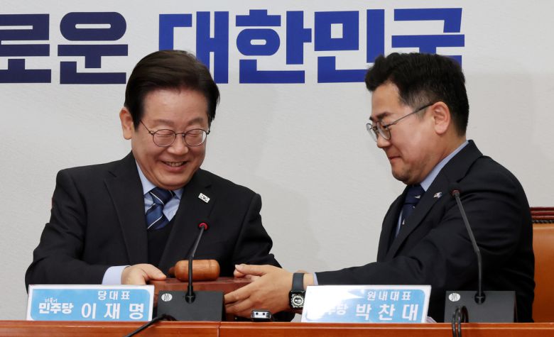의사봉 건네는 李 더불어민주당 이재명 전 대표(왼쪽)가 9일 국회 본청에서 열린 최고위원회의에서 당대표 사퇴 선언 뒤 박찬대 원내대표에게 의사봉을 건네고 있다. 허정호 선임기자 |
