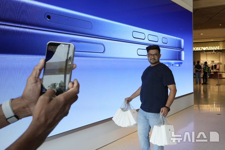 [뭄바이=AP/뉴시스] 20일(현지시각) 인도 뭄바이의 아이폰16 스마트폰 판매 첫날 한 고객이 애플 매장에서 아이폰16을 구매한 후 기념사진을 찍고 있다. 2024.09.20.