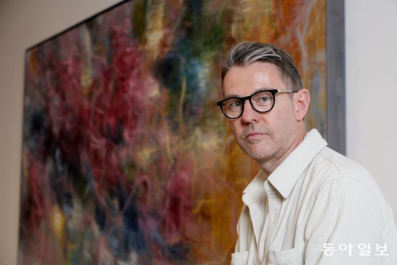 8일 서울 용산구 페이스갤러리 서울에서 만난 나이절 쿡은 고전미술가들이 인물의 팔 동작, 머리카락 같은 요소를 이용해 그림에 불어넣는 생동감을 자기만의 방식으로 재해석한다고 설명했다. 변영욱 기자 cut@donga.com
