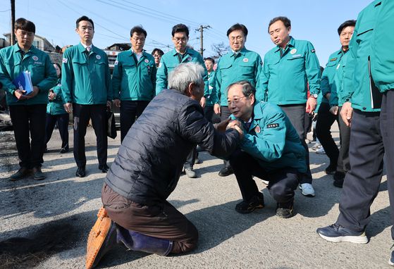 한덕수 대통령 권한대행 국무총리가 2일 오후 경북 영덕군 영덕읍 노물리 마을에서 산불 피해 지역 주민들을 위로하고 있다. 대통령실사진기자단