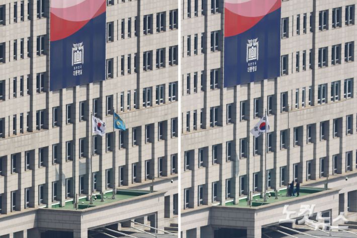 4일 헌법재판소의 윤석열 대통령에 대한 헌법재판소의 파면 선고가 내려지기 전 용산 대통령실에 봉황기가 게양돼 있다. 파면 선고 이후 대통령실 관계자가 봉황기를 내리고 있다. 사진공동취재단 |